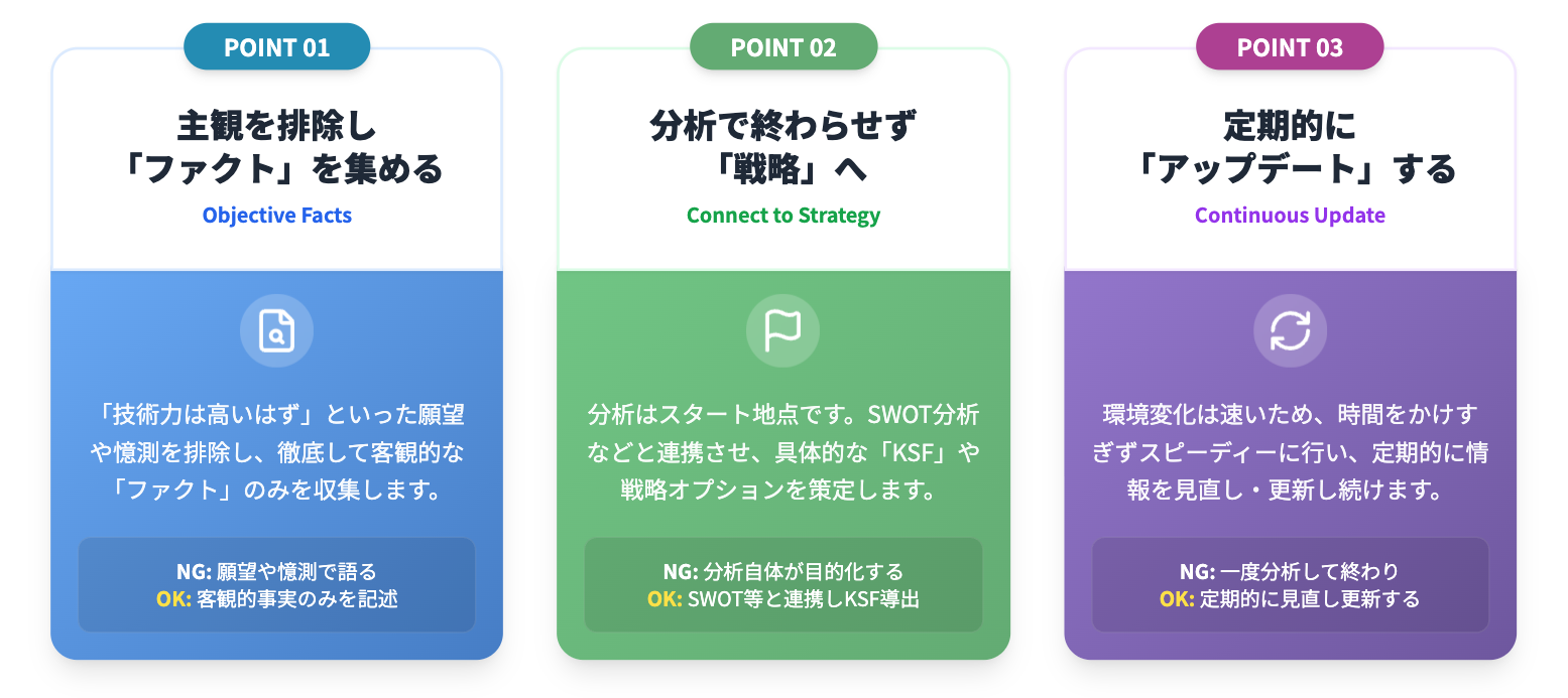 3C分析はフレームワーク自体がシンプルですが、実行者によってその質が大きく変わります。分析を「成功(=KSFの導出)」に導くためには、以下の3つのポイントを徹底する必要があります。