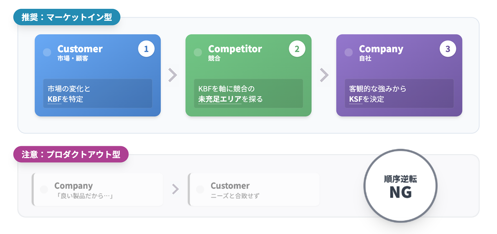 まず外部環境であるCustomerを定義し、次に同じ戦場にいるCompetitorを分析する。そして最後に、その環境下で自社がどう戦うべきかをCompany分析で決定する。この流れを守ることが、戦略の精度を高めるための絶対的な原則です。