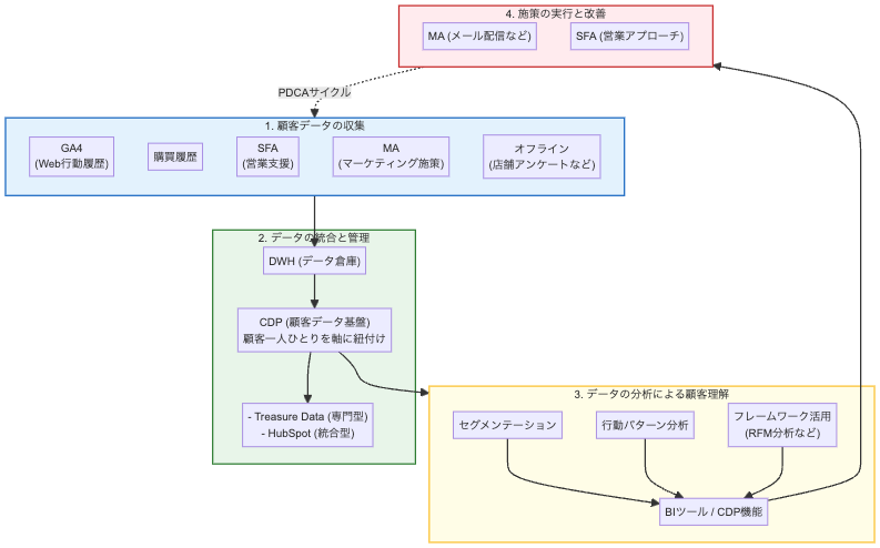 収集: GA4(Web分析)やSFA(営業支援)、MA(マーケティング施策)など、顧客とのあらゆるタッチポイントでデータが発生します。