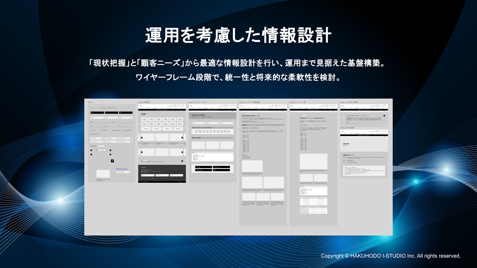 ポイント1で定めた戦略は、UI/UXの設計思想として具現化されます。私たちは、顧客視点に立ちながら、企業価値を正確かつ魅力的に伝えるための情報アーキテクチャ(IA)と、運用まで見据えたUI/UXで専門性を発揮します。