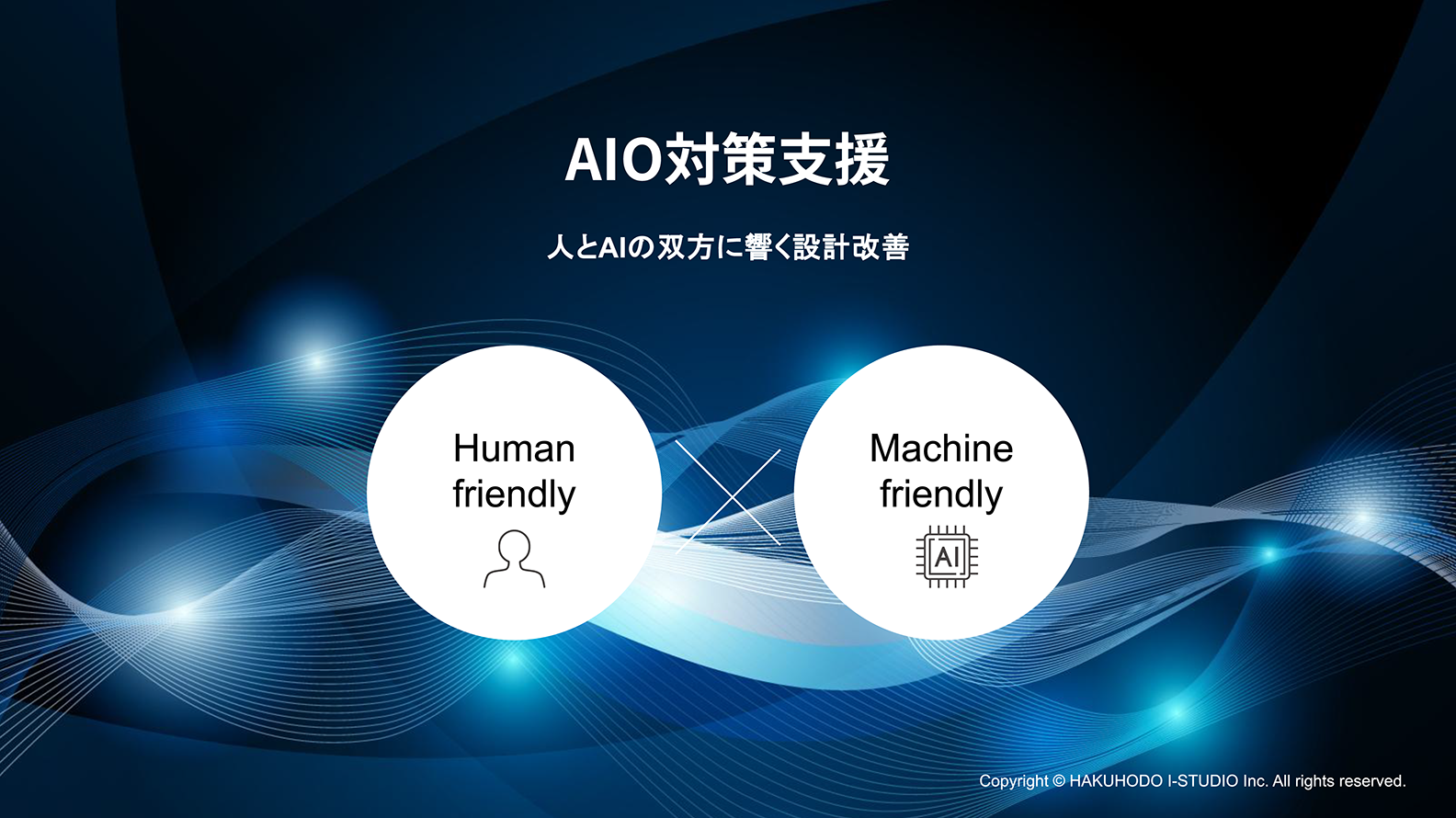 必要に応じて、AIO(AI Optimization)といった先端的なアプローチも活用します。「Human friendly(人にとってのわかりやすさ)」と「Machine friendly(AI分析ツールにとっての解析しやすさ)」の両立を目指す手法を通じて、Webサイトを強力な「武器」へと進化させます。