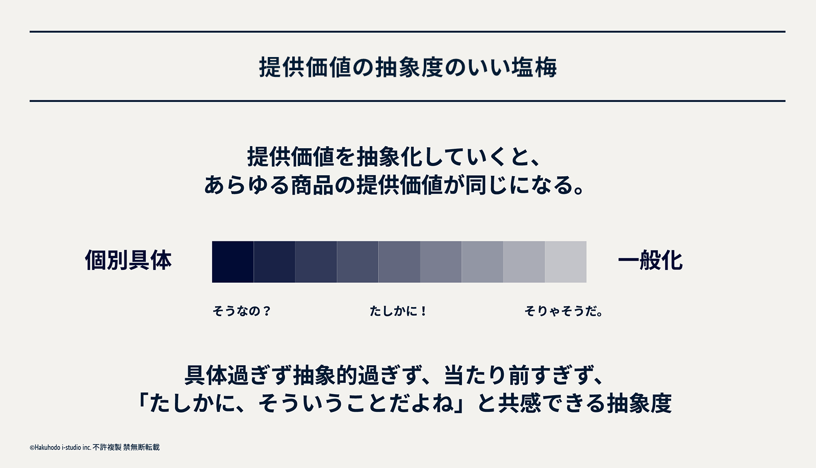 ポイントは、抽象と具体のバランスにあります。抽象的な提供価値は総花的で、「そりゃそうだよね」という印象を受けるし、個別具体すぎる提供価値は「ほんとに?」という印象を受けます。