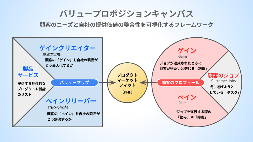 最も重要なのが、右側の「ペイン・ゲイン」と、左側の「リリーバー・クリエイター」が正しく紐付いているかを確認する作業です。顧客の切実な悩みに対応していない解決策は、バリュープロポジションとは呼べません。この一致を確認することを「プロダクト・マーケット・フィット(PMF)」への第一歩と呼びます。