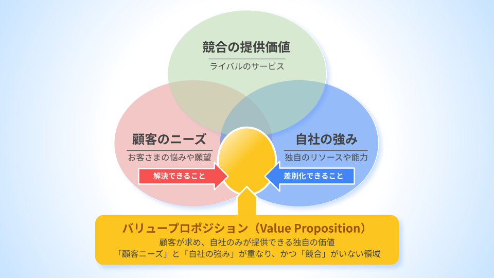 ここで目指すべきは、「顧客が求めており(Customer)」「自社が提供できる(Company)」が、「競合は提供できていない(Competitor)」という空白地帯を見つけることです。これこそが、あなたの会社が市場で陣取るべき「Value Positioning」です。