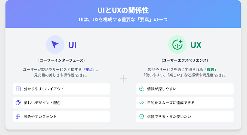 UXとは「User Experience」の略で、ユーザーがある製品やサービスを通じて得られる、すべての「体験」を指します。単に「デザインがおしゃれ」といった部分的なものではなく、「情報を探しやすい」「問い合わせがスムーズにできた」といった一連の体験すべてがUXです。UIは、優れたUXを構成するための重要な要素の1つと位置づけられます。